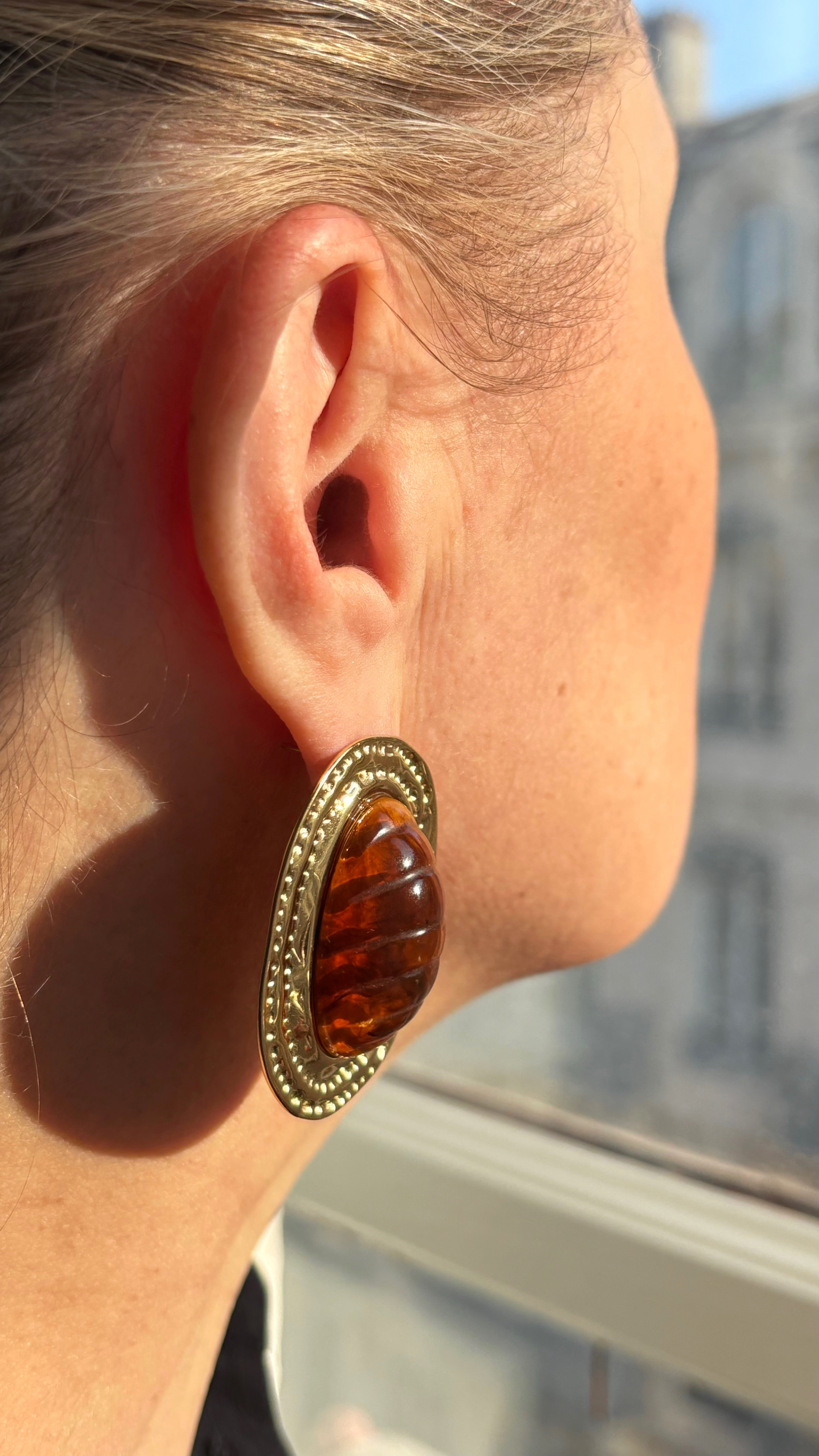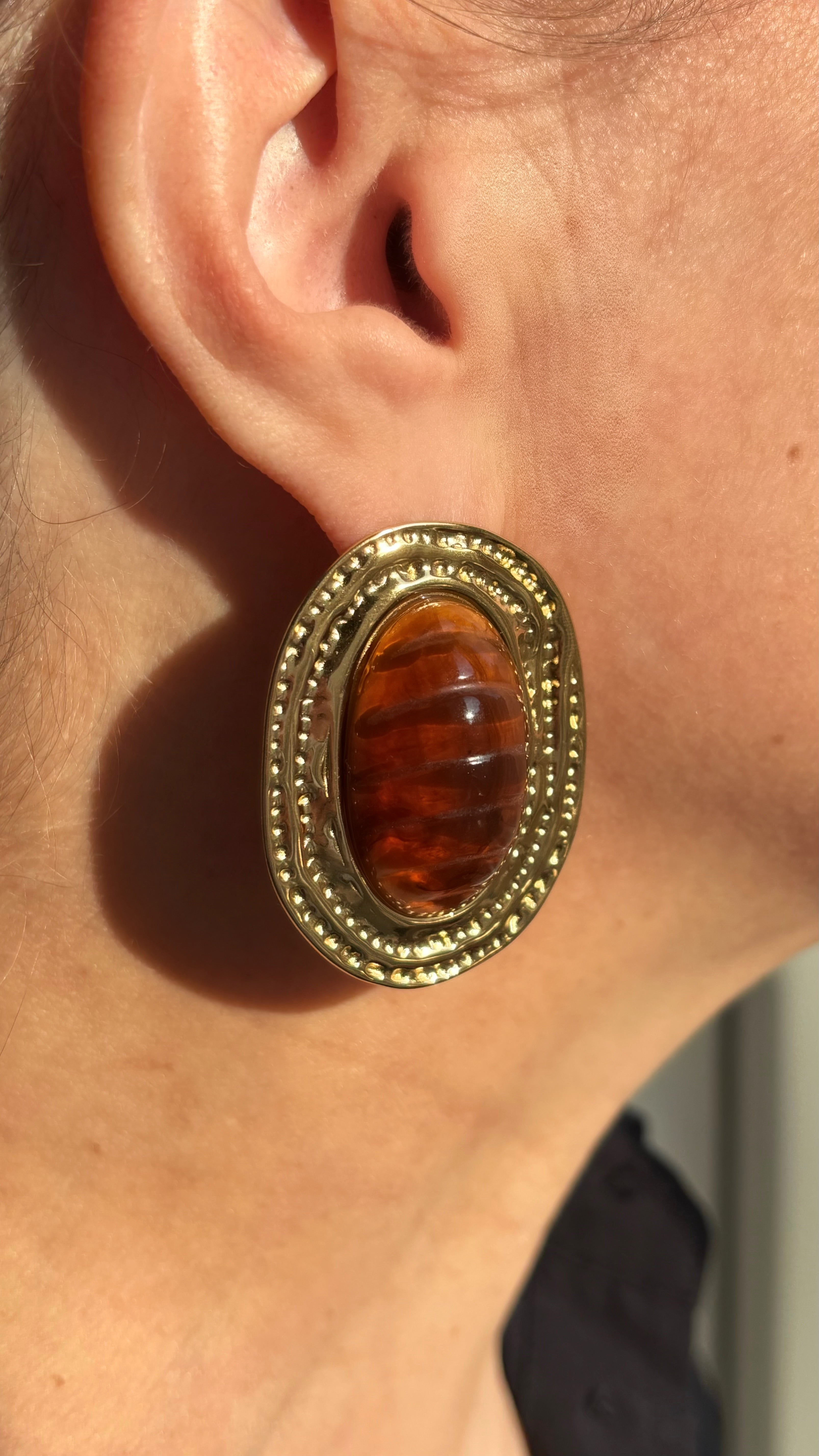 Les boucles d'oreilles à puce Aglaé en acier inoxydable se distinguent par un gros cabochon ovale en acétate camel. Ce dernier repose sur une pièce ovale aux contours martelés créant un contraste entre la douceur de l’acétate et la texture brute du métal. Un design élégant et moderne qui ajoute une touche de sophistication à chaque tenue.