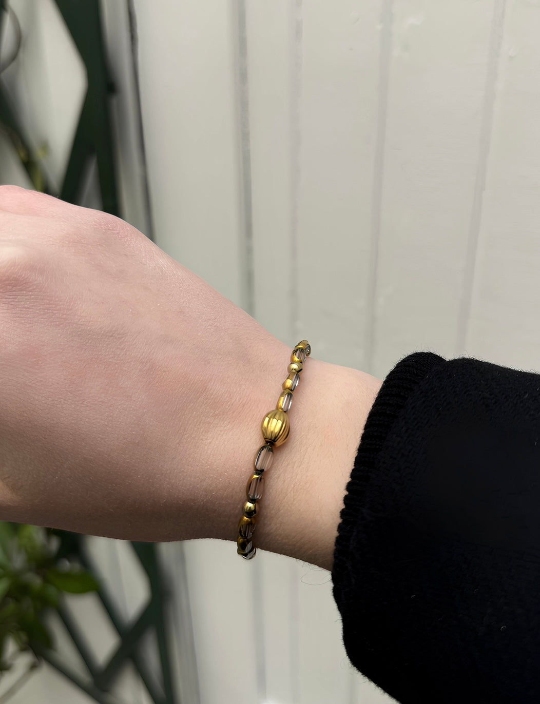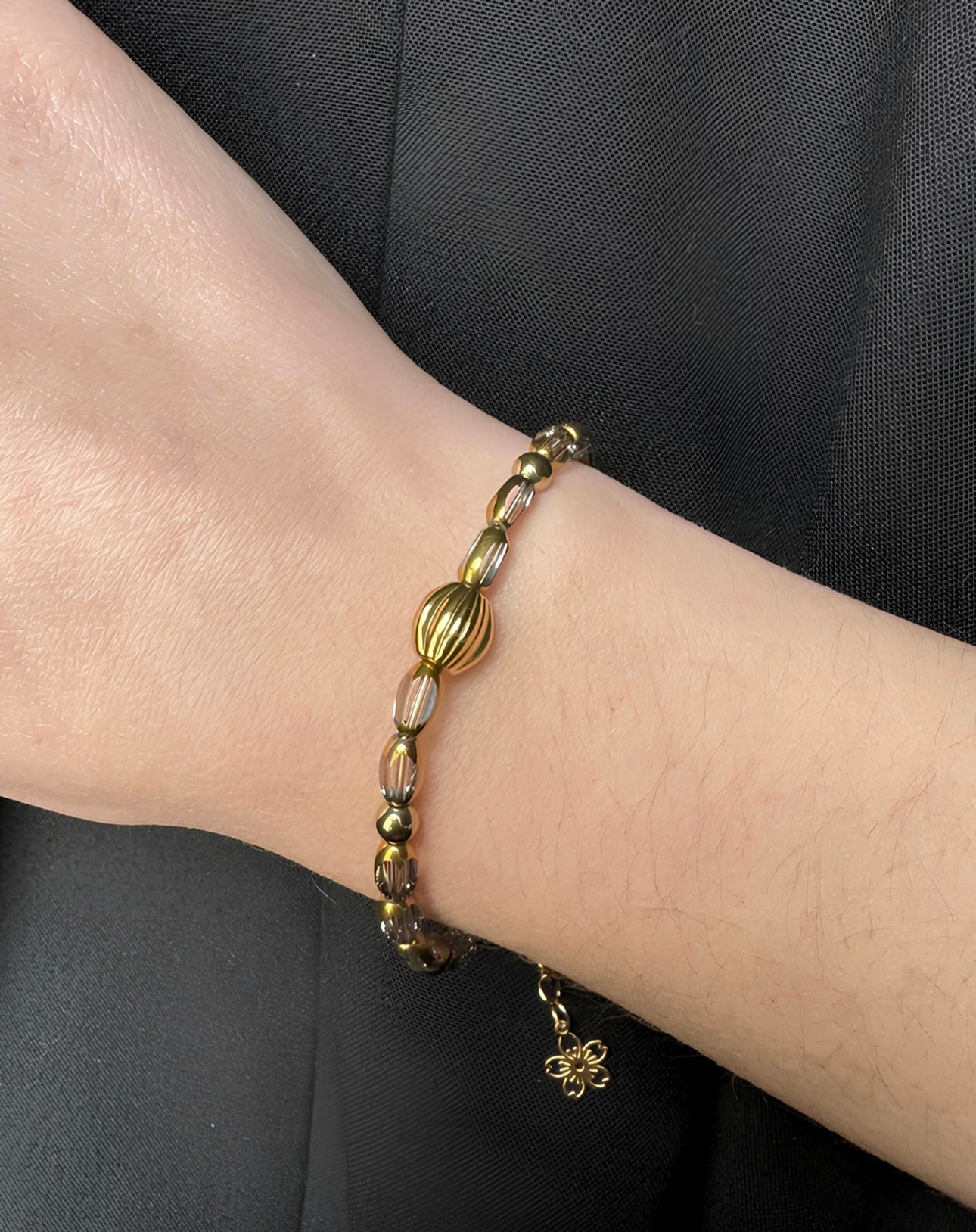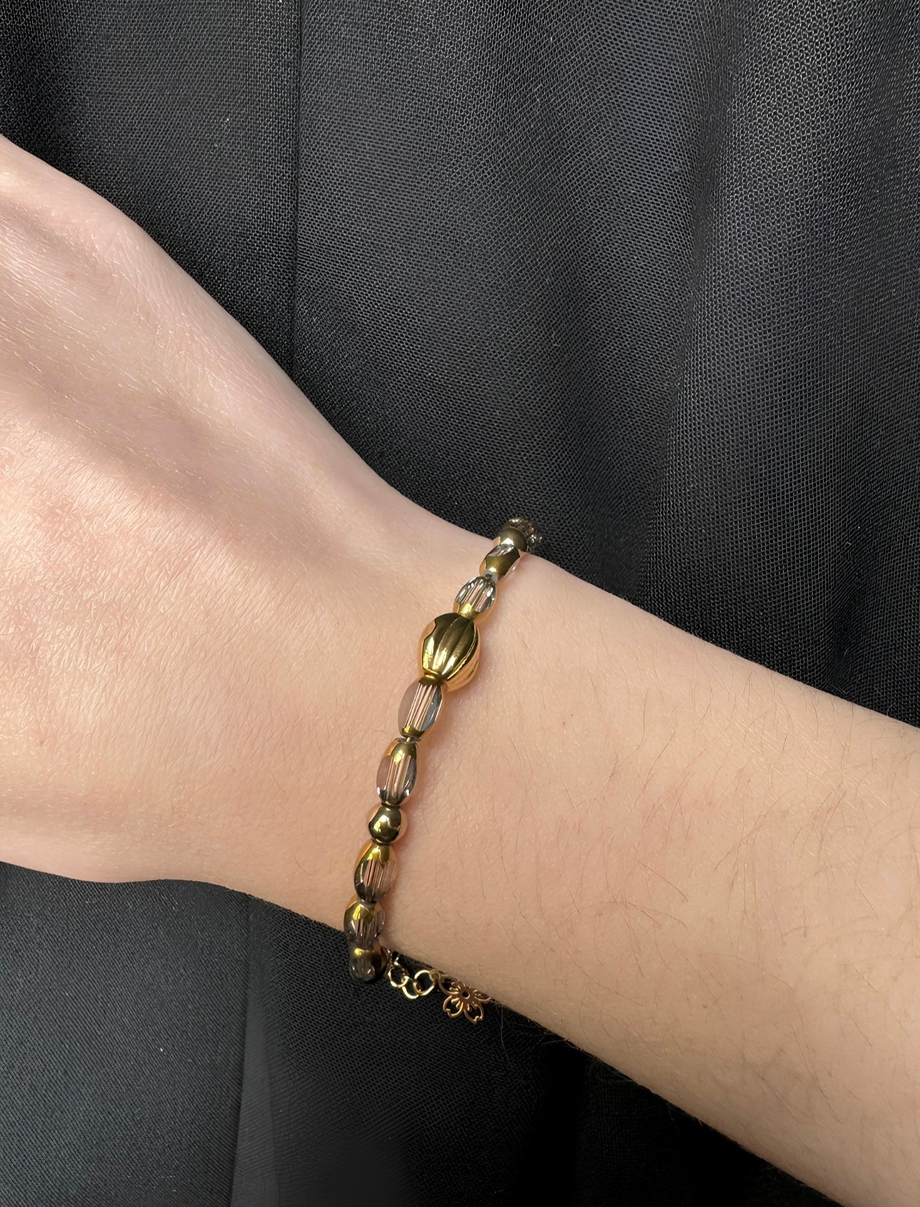 Le bracelet Rosalia large, création artisanale de notre marque, est un bijou raffiné qui marie harmonieusement des perles en verre ovales à facettes, les perles en hématite et des accents en acier inoxydable. Les perles facettées captent la lumière avec éclat.