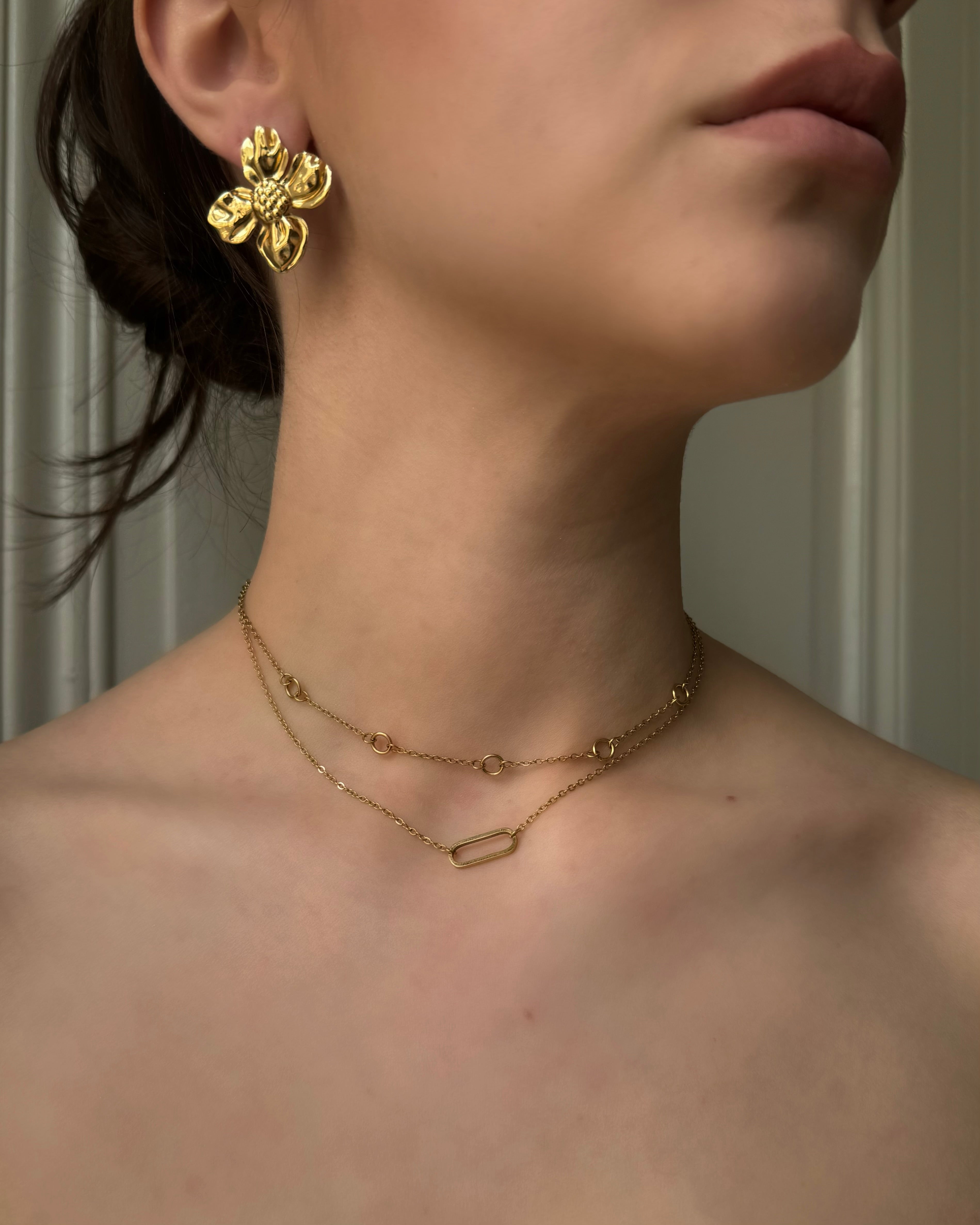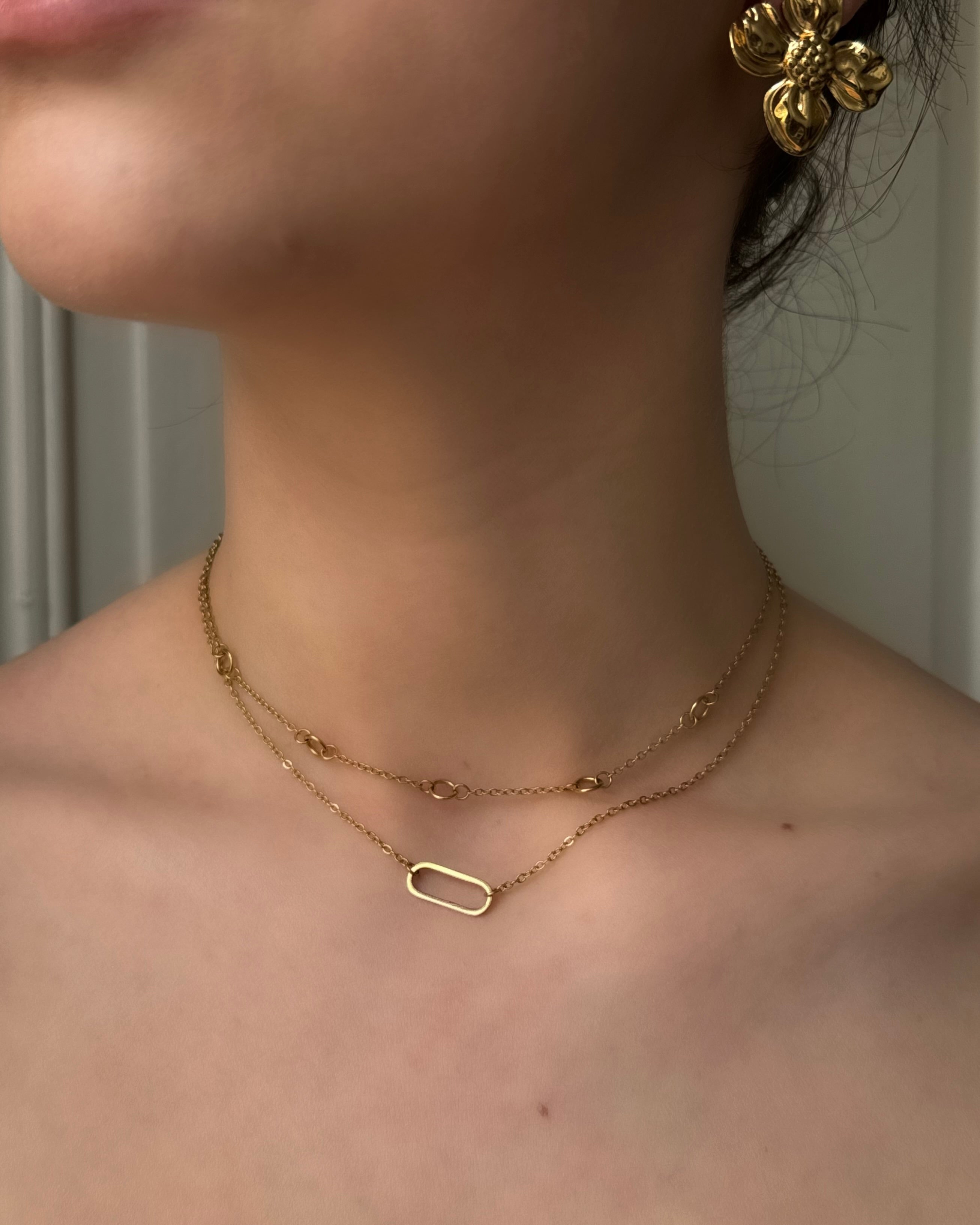 Le collier Juno est un bijou élégant composé de deux chaînes en acier inoxydable doré superposées créant un effet de profondeur. Chaque chaîne est sublimée par des cercles délicats ajoutant une touche moderne et minimaliste. Idéal pour sublimer vos tenues avec simplicité et raffinement.